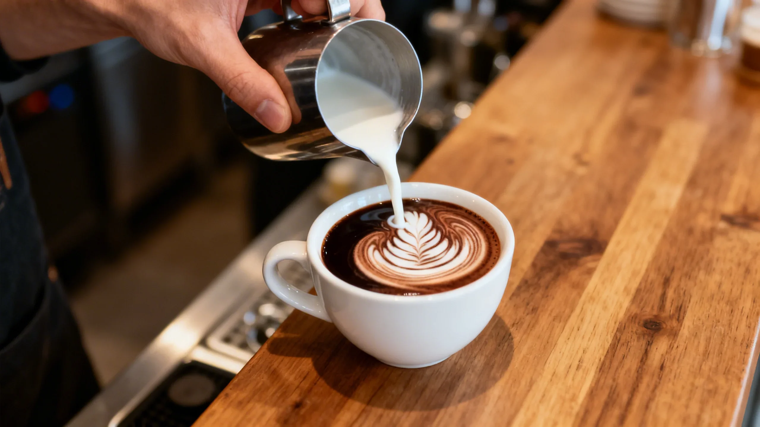 Le free-pouring est la technique emblématique du latte art. Le motif se forme uniquement par la façon dont vous versez le lait texturé dans la tasse. Aucun outil n’intervient.