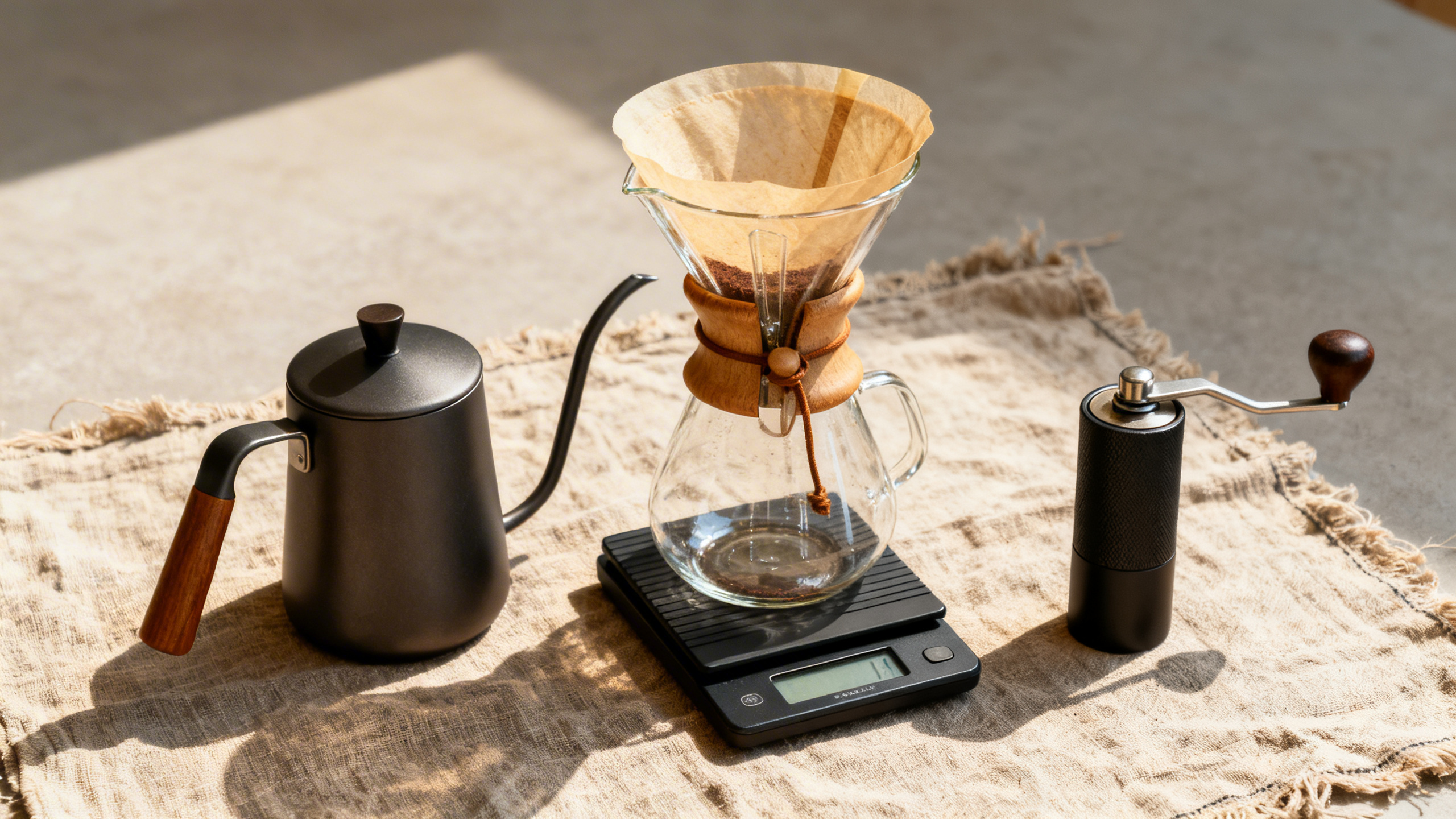 • Les équipements — Chemex, V60, French Press — sont durables, sans pièces électroniques susceptibles de tomber en panne, et fabriqués en verre, inox ou céramique recyclables.